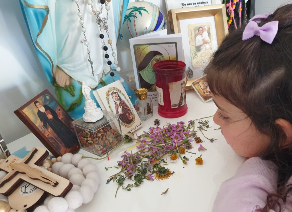 When I came back home she told me excited that she wanted to show me her “collection”. I asked her what collection she was talking about and she told me that it was a surprise. She guided me all the way to where our Altar is and to the Statue of Our Lady. She usually offers any flower she finds to Our Lady. Generally one or two daily since the lockdowns started, so I didn’t think much when she was taking me towards Her until I saw like 20 or more of small purple flowers. My daughter was proud and excited to show me her “collection” and all I could think of was a quote of St Therese: “I will send down a shower of roses from the heavens”… I truly felt this was a shower special for me… not roses, I know, but St Therese does know that my favourite colour is purple… so I’ll take it as a sign to keep peace in my heart.