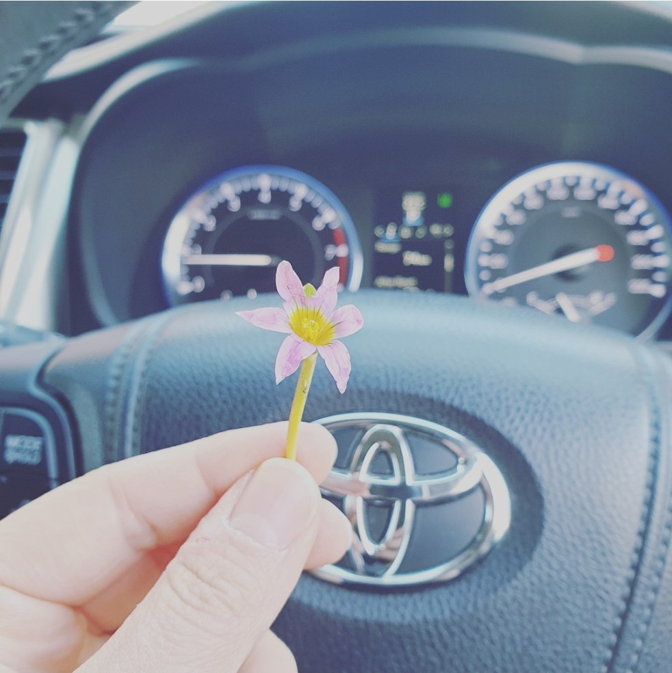 After a few days from starting The Novena Rose to St Therese and while I was in my car about to head out for a stressful appointment, all of the sudden I see my eldest daughter waving me from the backyard running towards me while my husband gives me a sign to wait for her. She approached my car window and told me “I have a surprise for you. Here”… and it was a cute purple flower from our grass.