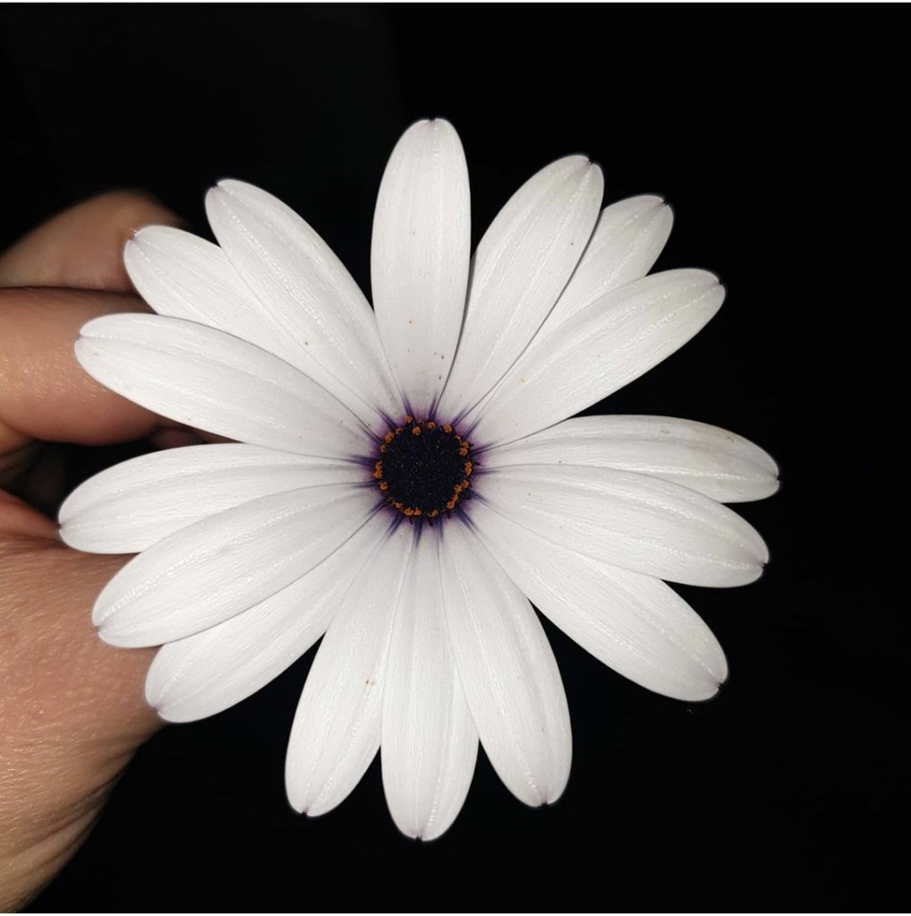 Afterwards the day went busy… I got the kids ready to go out, then my husband took my 2 oldest girls for a walk while I was getting ready myself and forgot about St. Therese. After a while my oldest came through the front door loudly and excited saying “look at this flower, mama!!”. I didn’t pay much attention thinking it was the flower she ALWAYS gets after her walks. After taking a glance of it, I frozed. I approached my daughter in shock and asked her to see it… and there it was, a beautiful white flower with a purple centre. PURPLE!. Being shocked is an understatement… I truly cried like a baby a minute after.